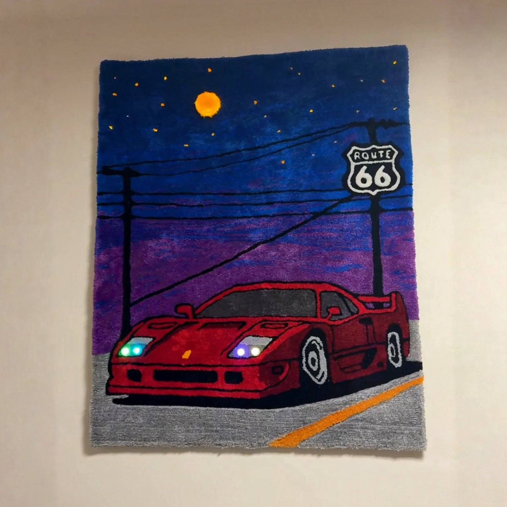 Noční snová projížďka po Route 66 ve Ferrari pod úplňkem a nebem plným hvězd. Díky integrovaným světlům se koberec probouzí i ve tmě, aby rozsvítil i vaše momenty.